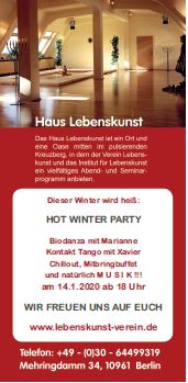 Biodanza mit Marianne, Kontakt-Tango mit Xavier, Chillout, Musik und Mitbringbuffet