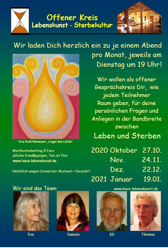 Der Offene Arbeitskreis Lebenskunst - Sterbekultur lädt einmal im Monat dienstags im Haus Lebenskunst ein zu einem Gedankenaustausch.
