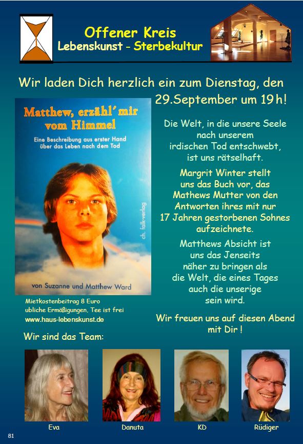 Der Offene Arbeitskreis Lebenskunst - Sterbekultur lädt einmal im Monat dienstags im Haus Lebenskunst ein zu einem Gedankenaustausch.