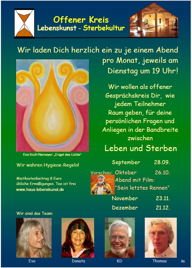 Der Offene Arbeitskreis Lebenskunst - Sterbekultur lädt einmal im Monat dienstags im Haus Lebenskunst ein zu einem Gedankenaustausch.