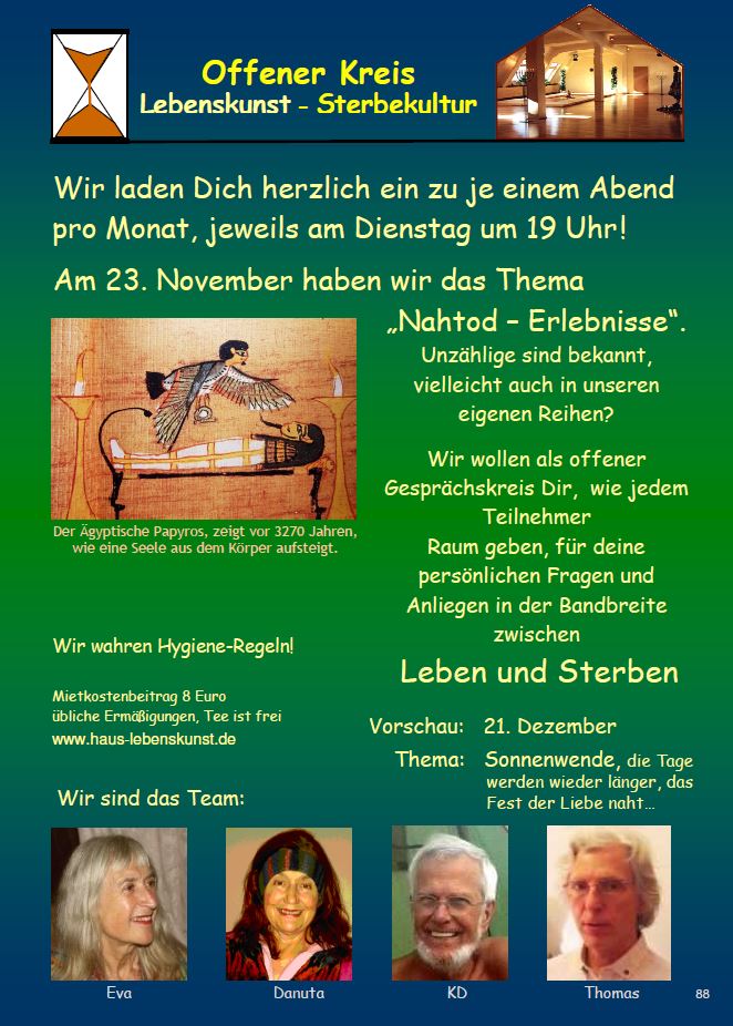 Der Offene Arbeitskreis Lebenskunst - Sterbekultur lädt einmal im Monat dienstags im Haus Lebenskunst ein zu einem Gedankenaustausch.