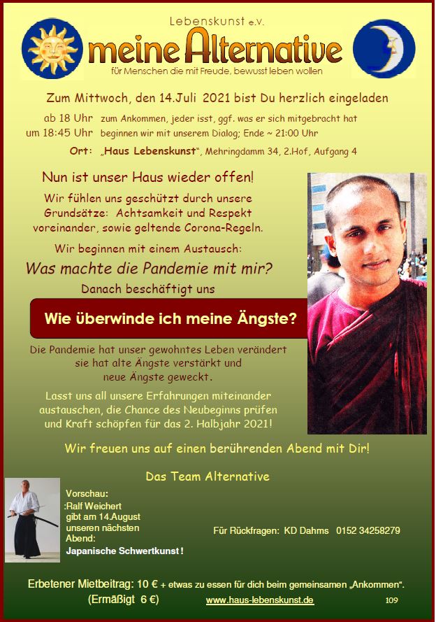 Das Team von "meine Alternative" lädt einmal im Monat mittwochs im Haus Lebenskunst zu einem gestalteten Abend ein, immer mit Gedankenaustausch.