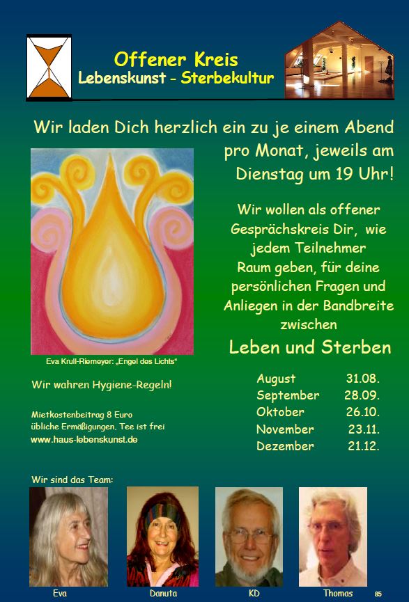 Der Offene Arbeitskreis Lebenskunst - Sterbekultur lädt einmal im Monat dienstags im Haus Lebenskunst ein zu einem Gedankenaustausch.