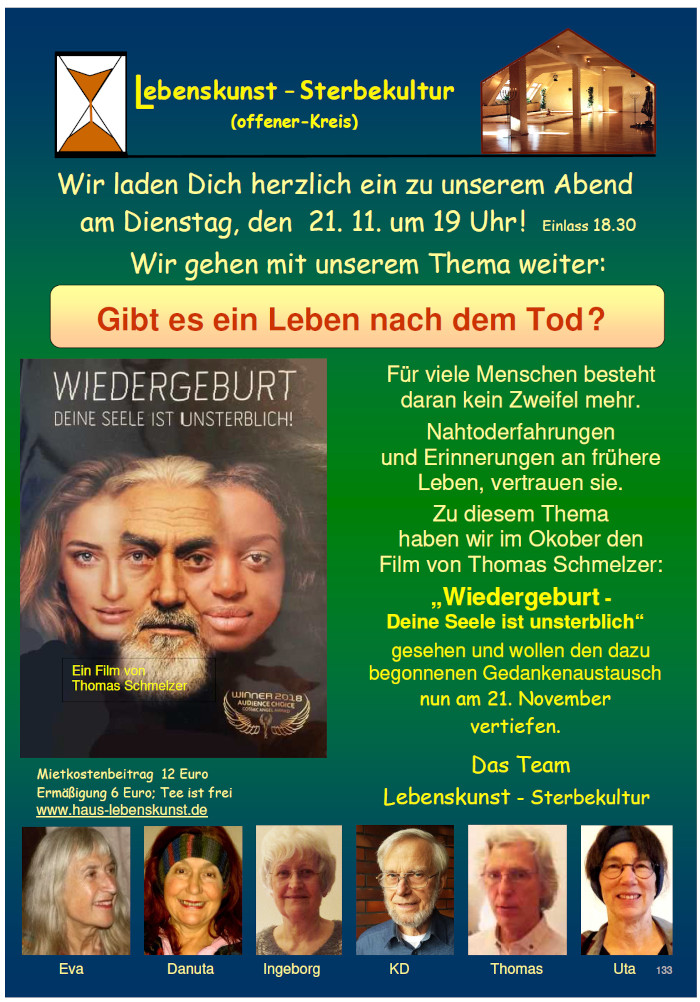 Der Offene Arbeitskreis Lebenskunst - Sterbekultur lädt einmal im Monat dienstags im Haus Lebenskunst ein zu einem Gedankenaustausch.